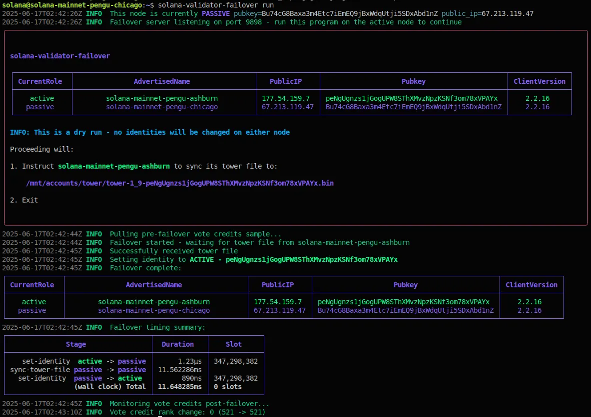 After the failover is complete, the newly active validator summarizes the time taken to transfer identities and the tower file before beginning monitoring the post-failover state. Monitoring involves querying the network for the validator’s active identity’s voting credits and rank for a period of time. Post-failover rank is ideally unchanged and vote credits are expected to be rising, indicative of successful voting activity by the active validator.