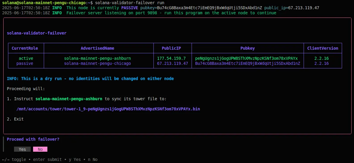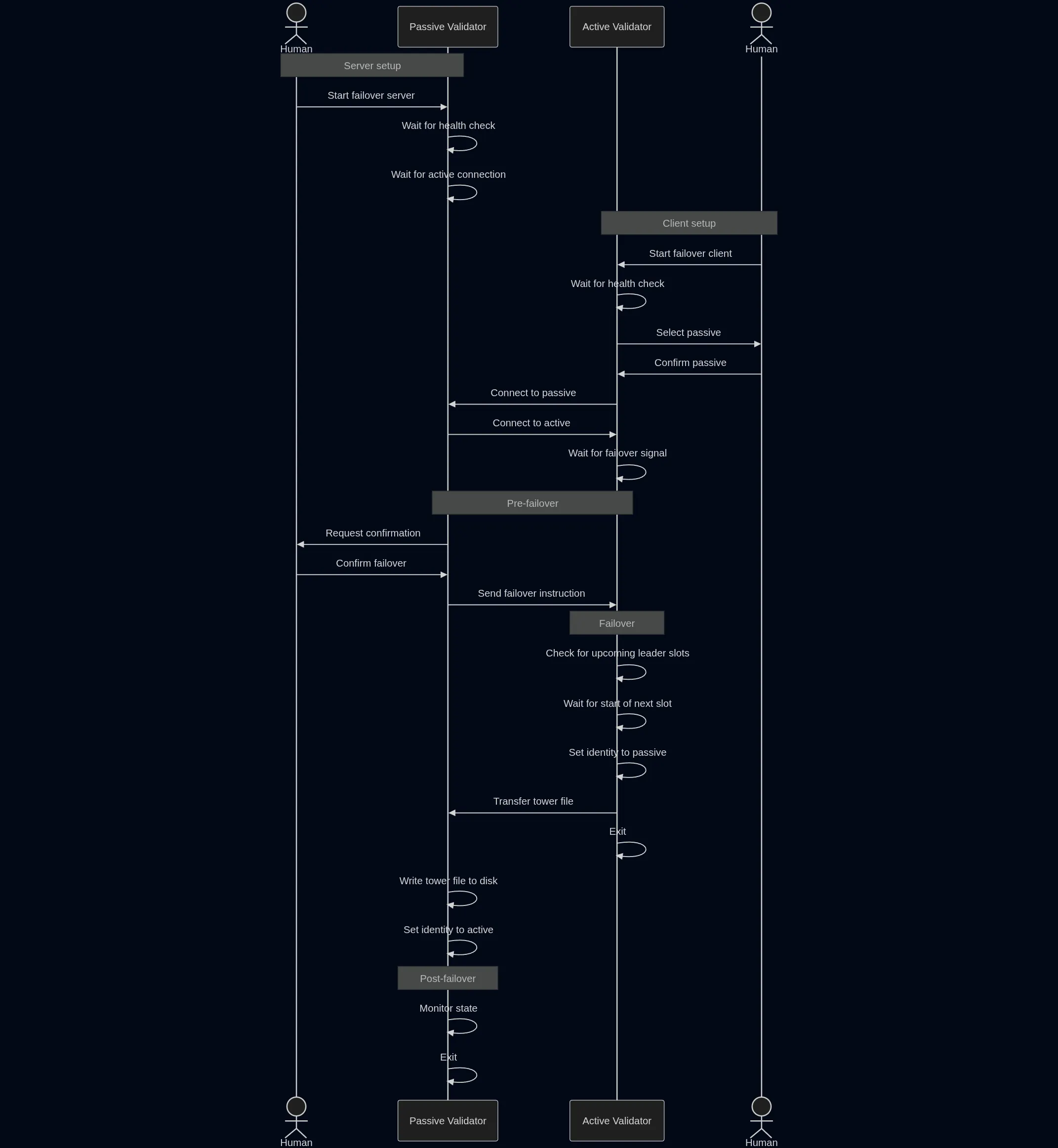 Once confirmed by the operator, the passive validator instructs the active one to begin the failover process. It does so by setting its identity to passive and streaming its tower file to the passive, soon-to-be active one.
