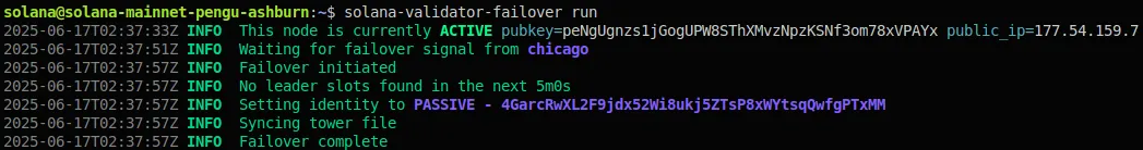 In essence, solana-validator-failover allows a passive validator to initiate a failover from an active one by starting a bi-directional QUIC stream over which they coordinate an identity and file transfer in as little as 10ms. Because a GIF is an easier watch than a wall of text, this is what a failover looks like from a passive validator’s point of view taking over from its active counterpart: